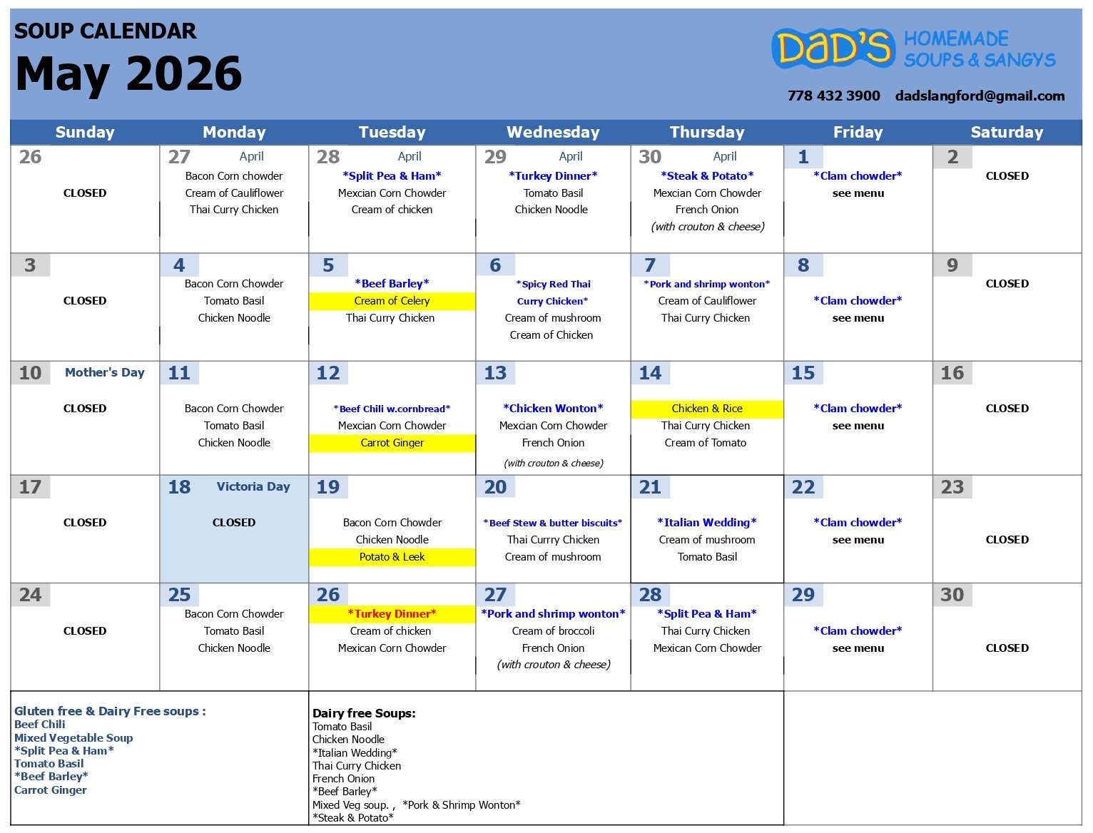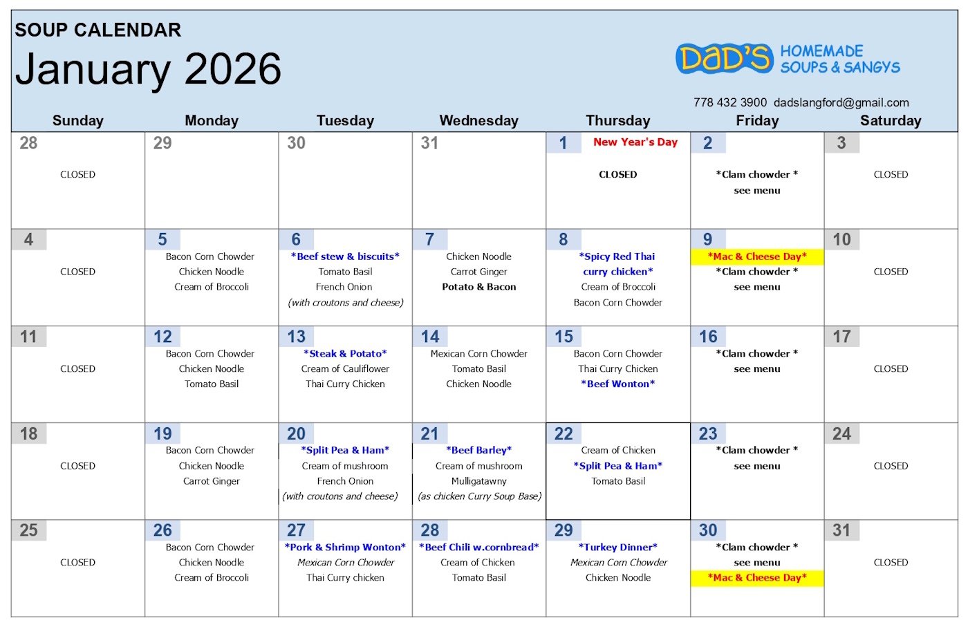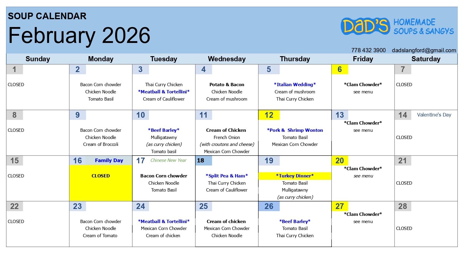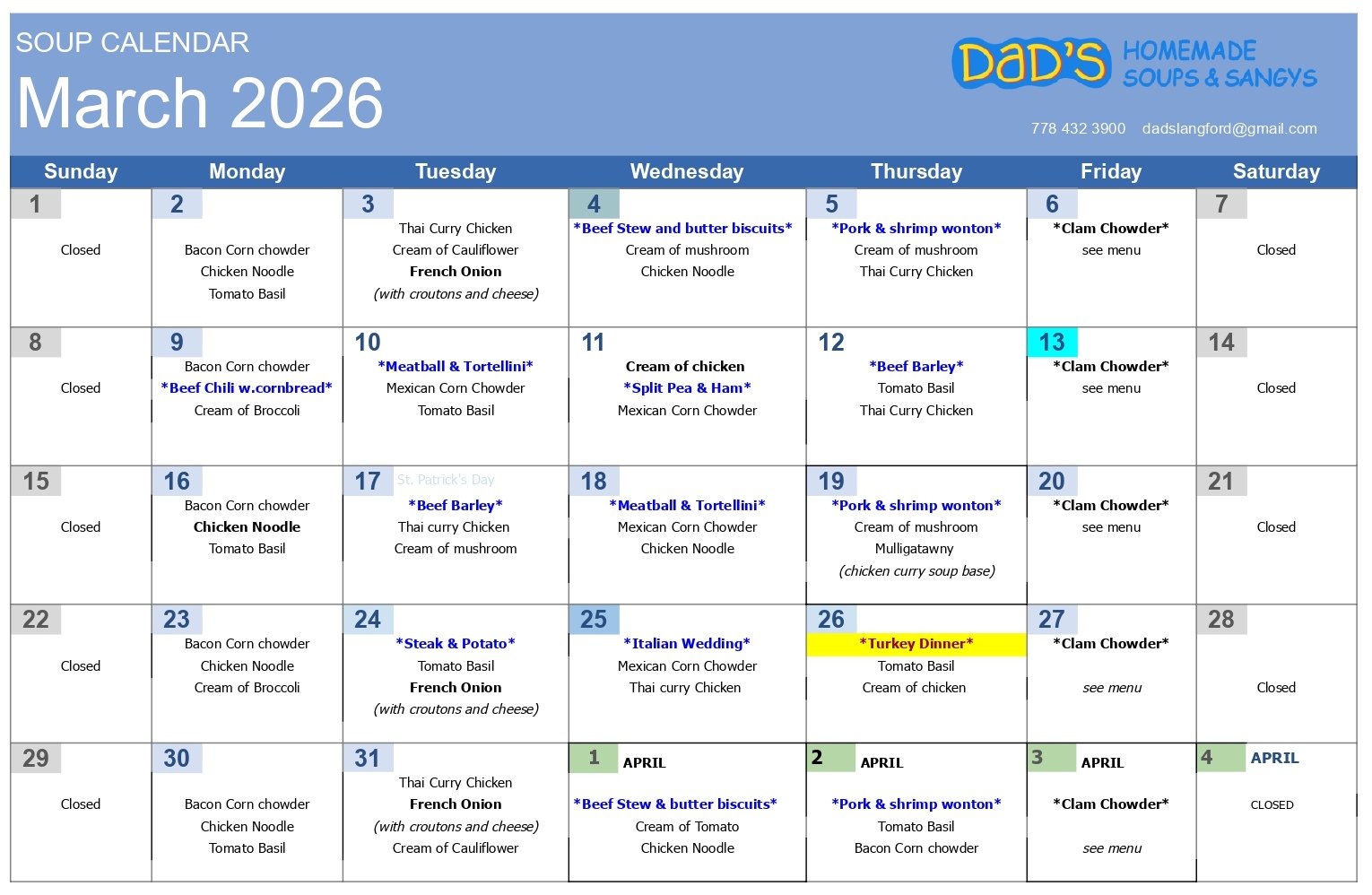 Soups of the day change daily, with a calendar posted for the month ahead!